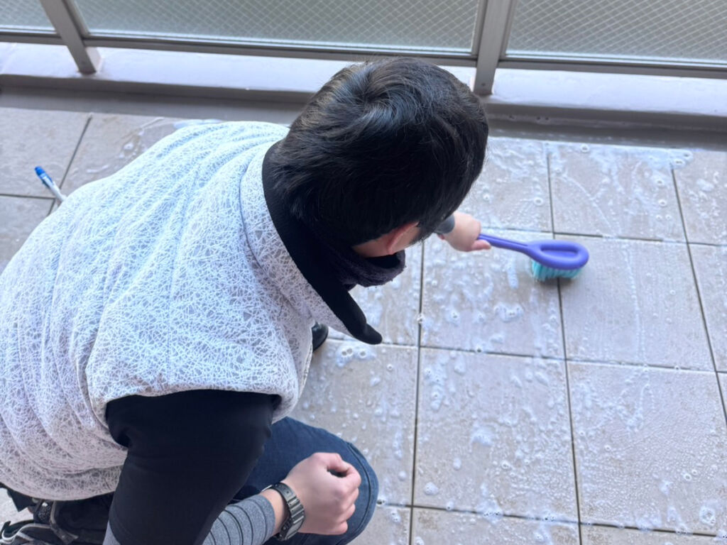 大きなゴミを手で拾い、ほうきで全体の砂ぼこりや枯葉をしっかり掃き集めて取り除きます。 - 目立つ汚れには中性洗剤を使用