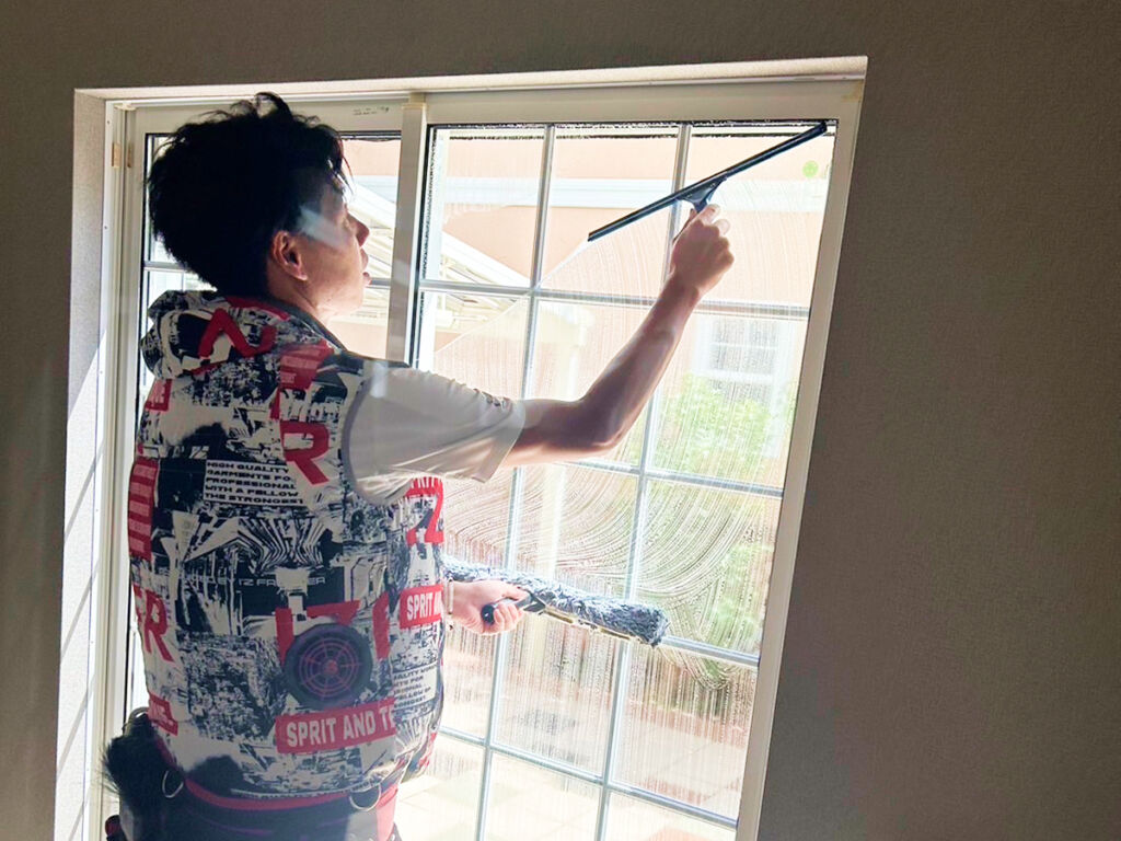 薄めた中性洗剤を含ませ、窓全体をやさしく拭きます。強酸性や強アルカリ性の洗剤は、ガラス表面を化学変化させてしまう「酸焼け」を引き起こす可能性があり、一度起きると元に戻せません。どうしても落ちにくい汚れは無理に対応しようとせず、プロの清掃業者に依頼しましょう。 - スクイージーは「水を切る」意識で